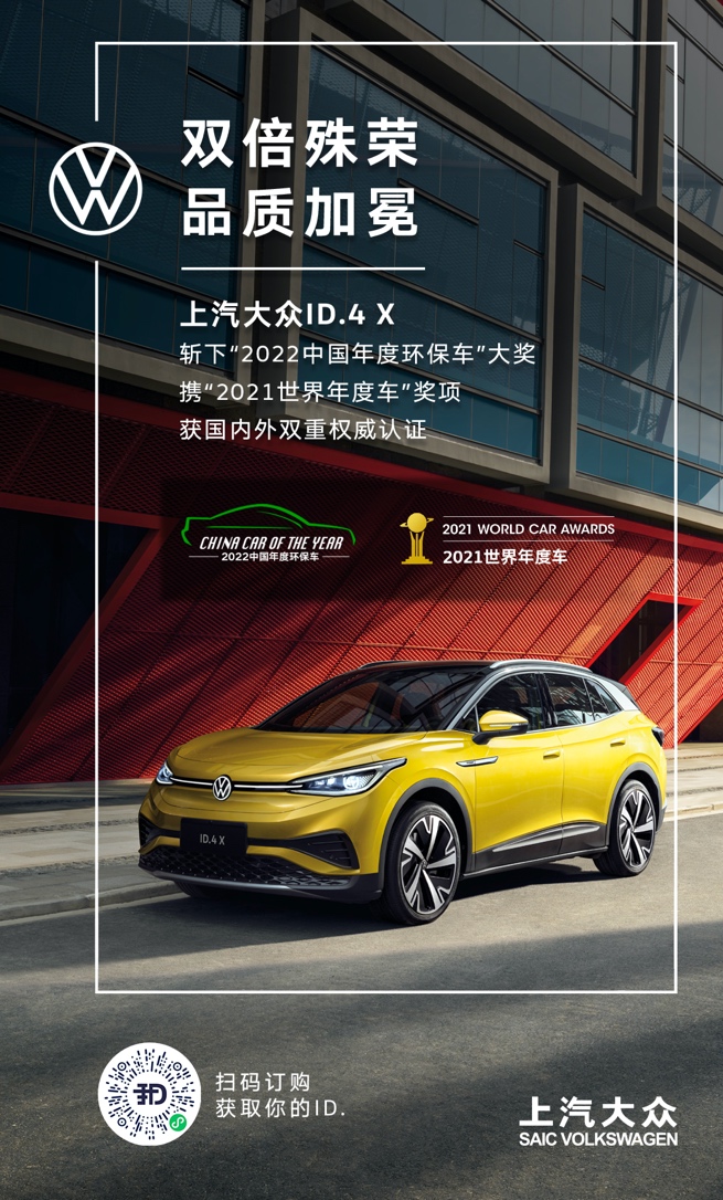 2022中国年度车(China Car of the Year)正式揭榜,上汽大众ID.4 X从32款入围车型中脱颖而出,斩获“中国年度环保车”。“中国年度车”权威性深受国际认可,各大奖项针对过去一年在国内上市的全新车型,由41位国内专业汽车媒体人经严格评测选出。其中,ID.4 X在“2022中国年度环保车”评选中获得了最高分。