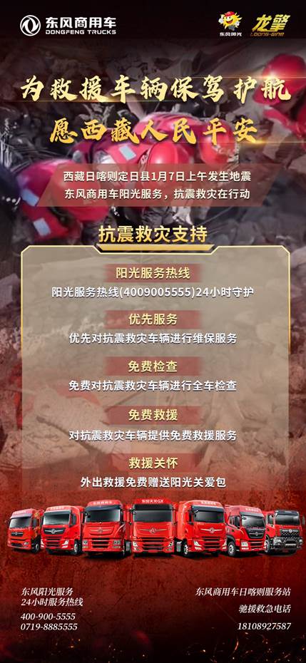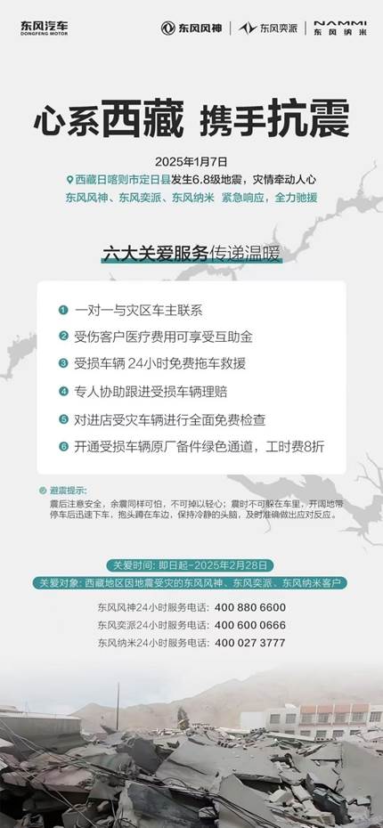 1月7日9点5分,西藏日喀则市定日县发生6.8级地震,灾情牵动全国人民的心。东风汽车集团有限公司(下称东风汽车)高度关注灾情动态,携旗下东风风神、东风奕派、东风纳米、东风岚图、东风商用车、东风本田、东风日产、东风越野车、东风股份、郑州日产等品牌,向灾区捐赠1000万元款物,其中,包括600万元现金和价值400万元的应急救援车辆,用于西藏日喀则市定日县及周边受灾地区的紧急救援、受灾群众生活救助及灾后重建等相关工作。同时,协同东风汽车旗下各事业单元立即行动,全力做好支援抗震救灾工作,积极履行央企政治责任和社会责任。