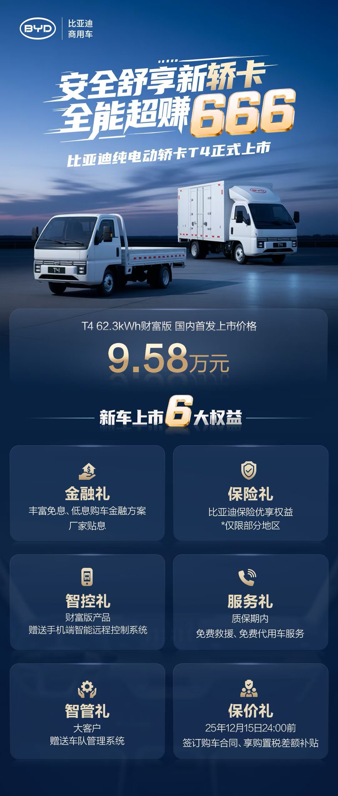 作为首款搭载DM技术的4.5吨级城市物流轻卡,比亚迪T5混动版本满油满电续航突破1100km,更有纯电版本提供多电量选择,满足城配与城际运输双重需求。今年9月,比亚迪新能源轻卡迎来第10000台正式下线,单月上险量达1,057辆,跻身行业前列,印证万千卡友信赖的产品实力。