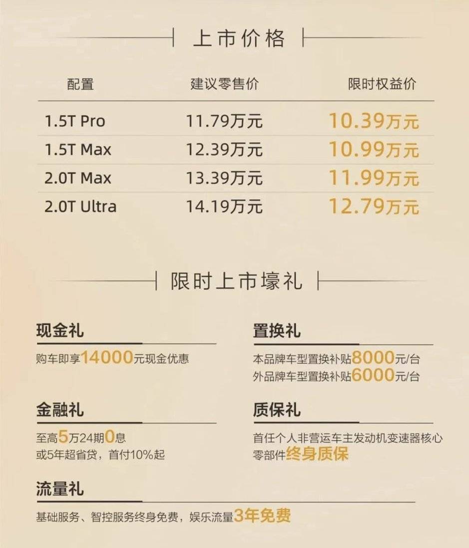 安全上,车身82%高强钢打造,关键部位用热成型钢,抗扭刚度提升15%;标配L2级辅助驾驶及25项主动安全功能。上市同步推出至高1.5万现金优惠、3年0息金融方案及至高8000元置换补贴。