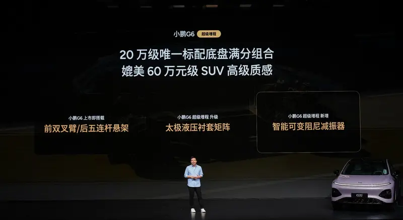 小鹏G6底盘立足用户需求持续进化,从最初专注单人运动操控,全面升级为满足一家人的驾乘舒适。此次,小鹏G6超级增程全系标配太极AI底盘,同级唯一标配前双叉臂/后五连杆独立悬架+太极液压衬套矩阵+智能可变阻尼减振器,以20万级唯一标配底盘满分组合,拥有媲美60万级SUV的高级质感,让每位驾乘者都能拥有良好的体验。新车还拥有行业领先的5项AI底盘能力,拥有感知广、执行快、可迭代的优势,可实现最远提前200m识别、最大提前300ms调节,并具备超强自学习能力,最快21天可迭代一个新功能,轻松应对城市、乡村、高速等多种路况,适配家庭全场景的驾乘需求。
