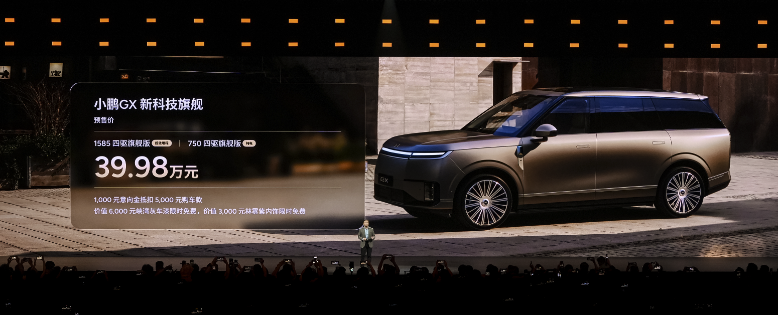 今日,小鹏汽车首款全尺寸旗舰SUV—— 小鹏GX重磅亮相并正式开启预售,新车带来纯电和超级增程两个版本,预售价39.98万元。小鹏GX纯电版四驱纯电续航高达750km;超级增程版纯电续航430km,综合续航1585km。即日起至小鹏GX上市日,用户可享预订限时权益:1000元意向金抵扣5000元购车款,价值6000元的峡湾灰车漆、价值3000元的林雾紫内饰限时免费。