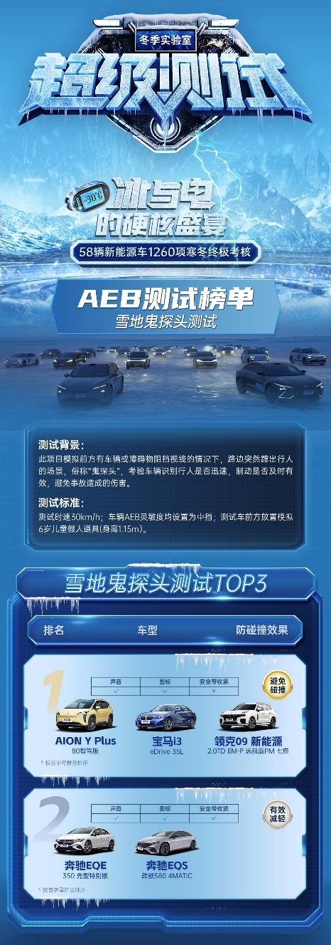 得益于ADiGO PILOT智能驾驶系统,AION Y Plus可实现L2级别的智能驾驶辅助,包括主动刹车、车道偏离警告、车道保持辅助、自适应巡航等功能。在汽车之家冬季实验室的“雪地鬼探头测试”中,AION Y Plus更是凭借出色表现脱颖而出,获得排名第一的好成绩!