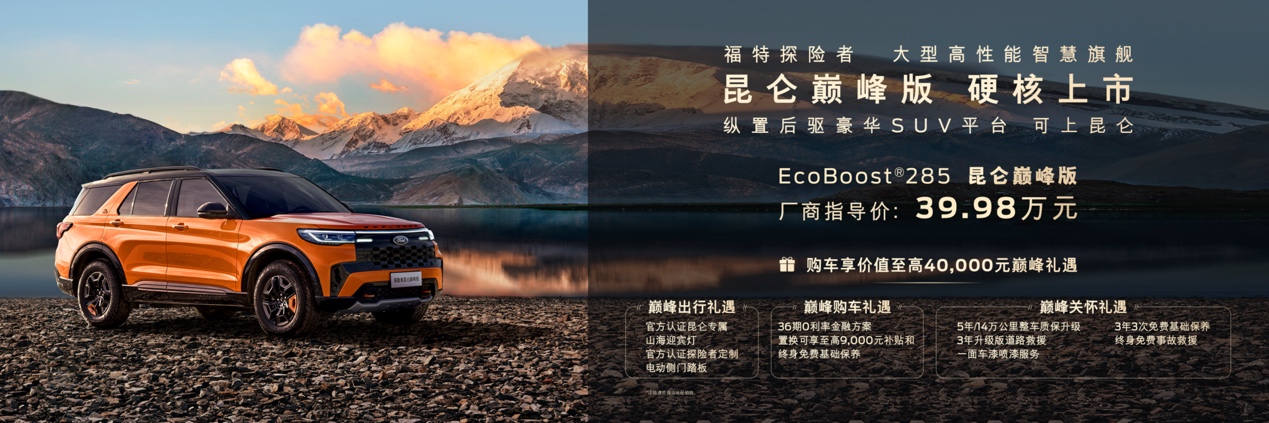 用探险,犒赏人生。作为福特SUV造车理念的集大成者,福特探险者经历长达32年的沉淀、6次换代,每一代都引领SUV的革新,全球累计销量超过800万台,始终以真正的探险者精神承载着人们进取和追梦的旅程。昆仑巅峰版的到来,再次冲破边界,以更硬派出位造型、更强悍性能不负旗舰之名,以“比豪华更越野,比越野更豪华”的强悍实力打破固有市场格局,开立40万级别新细分市场,赋予用户更加耀眼的新价值,将充分满足用户既要功能,又要舒适,还要够潮的多元化用车所需,助力心存高远的时代探险者们再攀人生高峰。