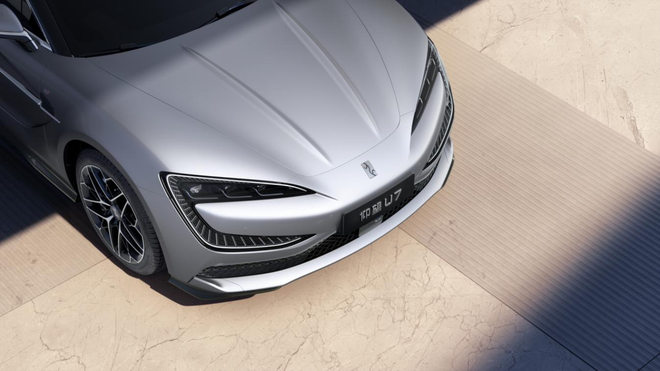 “时空之门”家族式设计语言的又一卓绝之作,仰望U7以创新科技融合艺术格调,打破传统D 级轿车的设计风格,运动性能与优雅兼备,开启未来新新能源旗舰轿车美学设计新思考。融合运动与儒雅的前脸修长锐利,加之前舱盖微微隆起的筋条,气场全开。极具辨识度的星际穿越大灯与车头曲线完美契合,将数字化的信息交互巧妙融入其中。车头双C 环抱设计搭配平和的拐点曲线,拥有连贯的型面设计并有穿插渐变的效果,当仰望U7的灯语点亮,LED 灯光由内而外放射,勾勒出时空之门的轮廓,宛若一扇通向未来、驾驭梦幻的大门。