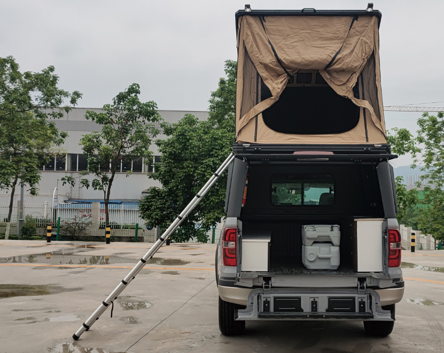 车顶帐篷展开后,其高度和长度都令人瞩目。长度达到2500mm的睡眠空间,确保了宿营者能够享受到宽敞舒适的睡眠环境,车厢内、外皆可自由出入帐篷,方便快捷,私密性好。而货箱内部空间同样充足,帐篷底部床边可以两侧打开,货箱内部最高可达2600mm,最大限度释放内部使用空间,配合储物柜实现坐下休息的功能。不仅标配高盖帐篷、灭火器、外置爬梯等实用设施,还有丰富的选配项目可供选择,如左右侧储物柜、折叠洗菜盆、清/灰水箱、电磁炉、便携马桶以及多功能插座面板带USB Type-C接口等,让宿营生活更加便捷多彩。选装两侧边柜不仅可用于物品收纳,还能充当座椅使用,一物多用,实用性极强。