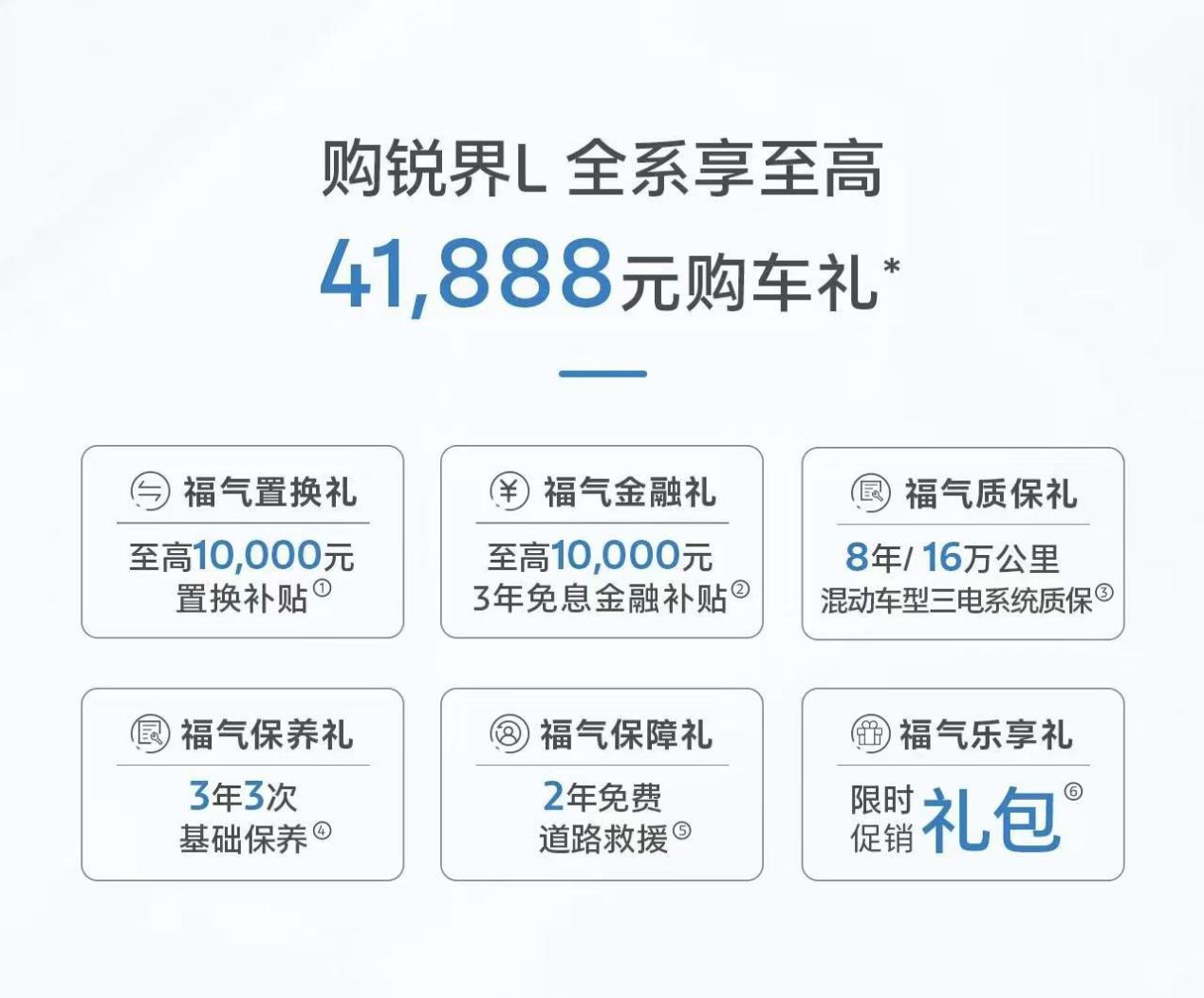 新车上市之际,2025款福特锐界L全系同步推出购车政策,购车即至高享41,888元购车礼,包括: