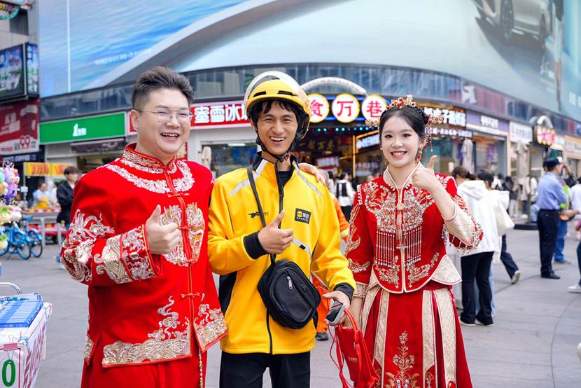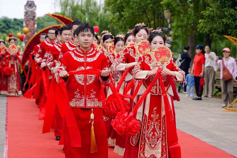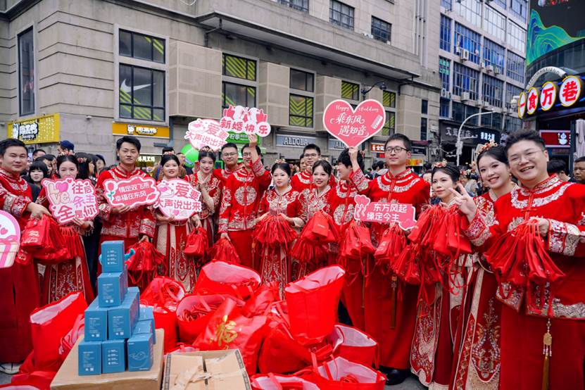 仪式落幕,欢乐不减。新人们还前往汤湖公园楚园、芙蓉园、环湖绿道、游船码头等景观点打卡,无人机在空中定格下“我爱东风”的浪漫造型。下午,新人车队转场江汉路步行街,这里早已热闹非凡,一场融合青年乐队表演、非遗体验与喜糖派送的快闪活动热闹开启——2000份印着东风LOGO的定制手提袋里,装着寓意“十全十美”的喜糖,派发至现场观众手中。接过喜糖的市民笑着道贺,有的还拿出手机拍摄,“沾沾你们的喜气!”的祝福声此起彼伏,交织成动人的城市乐章。