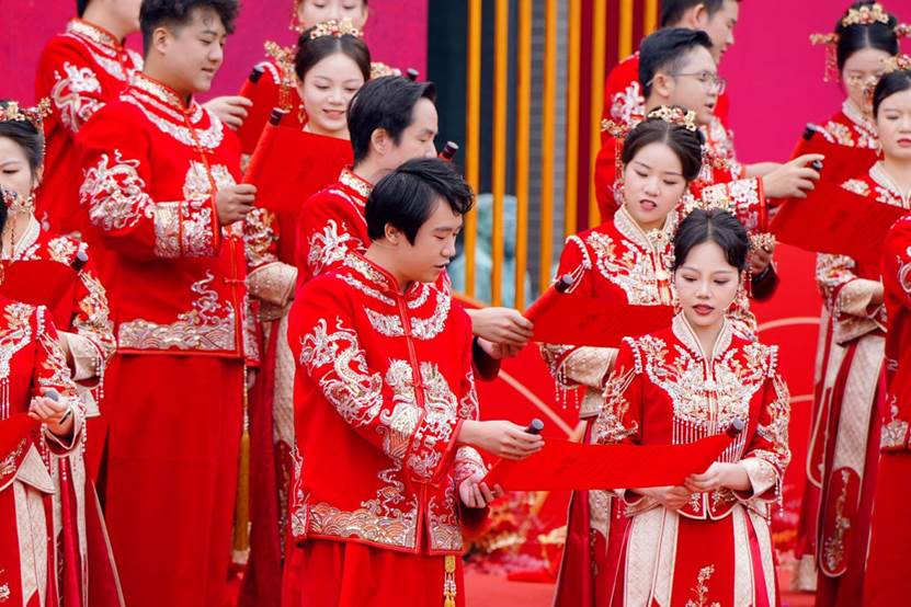 “愿此生,执子之手,与子偕老;乘东风共甘苦,互助精诚,同心与共……”全体新人齐声朗读婚书,字字铿锵、句句深情,将对爱情的坚守与对企业的感情融入誓言。他们携手成为相携并进的知音伴侣,将共同开启幸福旅程。