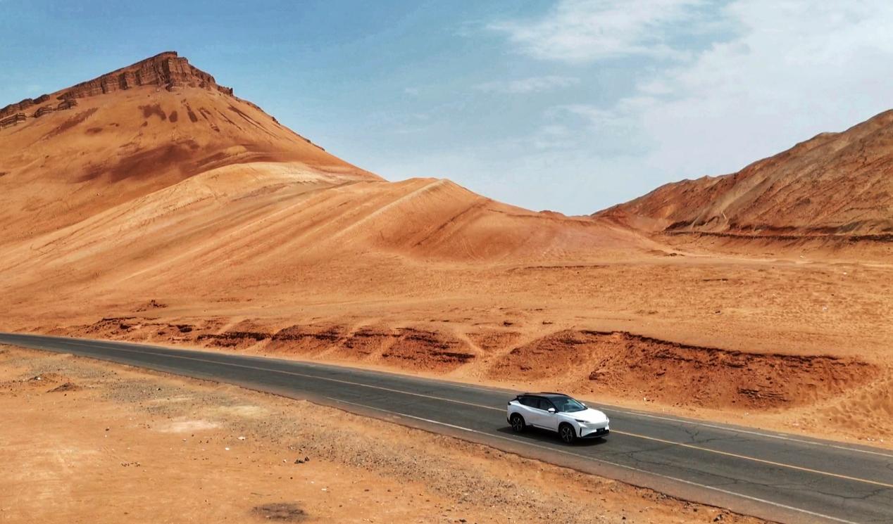 驶出敦煌,示界06便在戈壁滩的烈日下迎来严苛考验。得益于62.36kWh大容量电池与宽温域热管理系统的协同工作,车辆即便在高温环境下依然表现出稳健的续航实力,让这场丝路穿越之旅始终从容不迫。