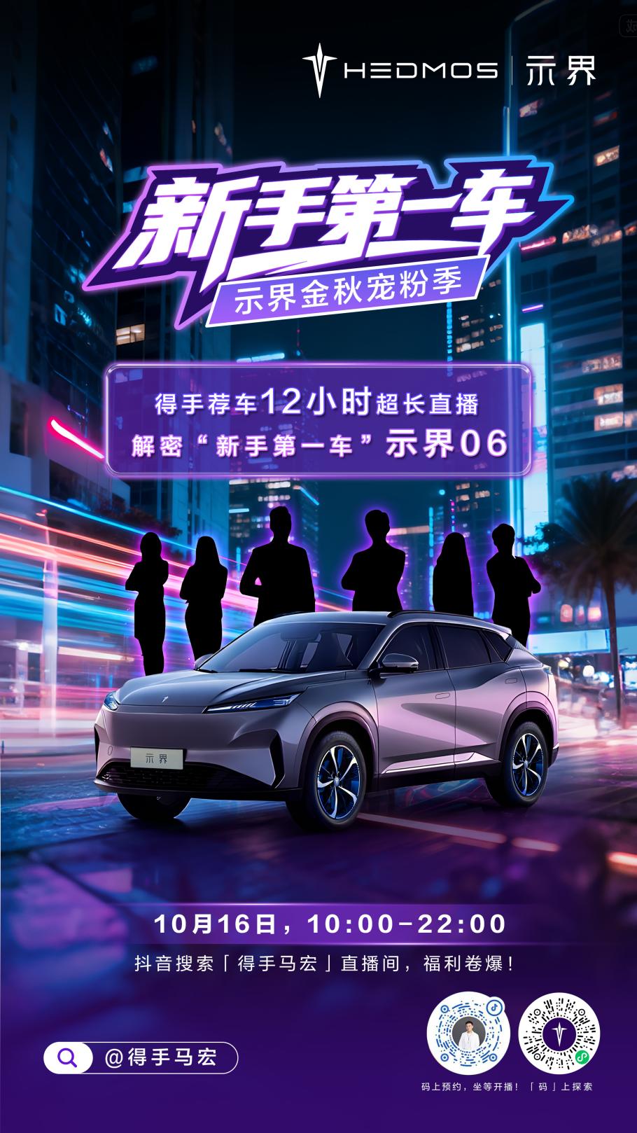 示界06不仅是一台车,更是一种生活方式的载体。此次“驭示界见世界”青甘线体验虽已结束,但示界06的探索之旅才刚刚开始。此刻,我们诚邀您共同见证:10月16日10:00-22:00,将在抖音「得手马宏」直播间举行“得手荐车”12小时超长直播,深度解密这款被誉为“新手第一车”的示界06。