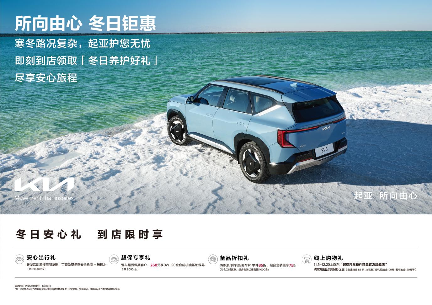 11月5日,悦达起亚宣布正式开启2025年“所向由心·冬日钜惠”冬季售后关怀服务活动。活动期间,用户可享安心出行礼、超保专享礼、备品折扣礼,以及线上购物礼等多重福利,为车主打造全方位的冬季用车保障,一路尽享安心旅程。