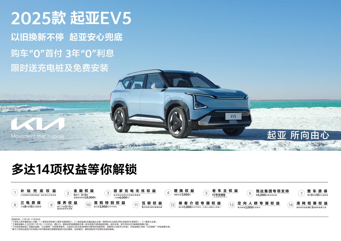 具体来看,在11月1日-11月30日活动期间,用户购买2025款起亚EV5,即可享起售价14.98万元,而且还有至高14项超值购车权益,无需费心计算,优惠力度透明可见,让每一分预算都花在刀刃上。其中包括以旧换新补贴取消地区,补贴兜底权益、3年0首付0息(金融贴息至高23,000元)、赠送充电桩及免费安装服务(价值4,000元)、7,000元增换购补贴、起亚老车主购车赠2年交强险(2,600元/2年)、悦达集团5,000元购车抵扣券、整车5年或10万公里质保、三电8年或15万公里质保、5年5次基础保养材料免费、价值3,000元APP积分首购特别权益、5年免费无限全数据流量、保客介绍专属权益可获1,000元APP积分(介绍人&购车人同享)、定向人群购车即享2,000元充电卡等优惠,以及限时购车抽取4天3晚澳网观赛之旅等多重权益。