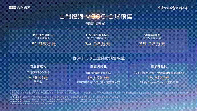 1月7日,吉利银河旗下V系列的首发之作,“AI全场景家庭旗舰MPV”——吉利银河V900正式开启预售,共计3个版本,预售指导价格区间为31.98万元~38.98万元。新车围绕中国大家庭出行的真实需求,以宽奢空间、豪华驾控、全维安全、AI智能几大全能满配实力,重新定义豪华旗舰MPV价值标准,树立AI全场景豪华出行新高度。