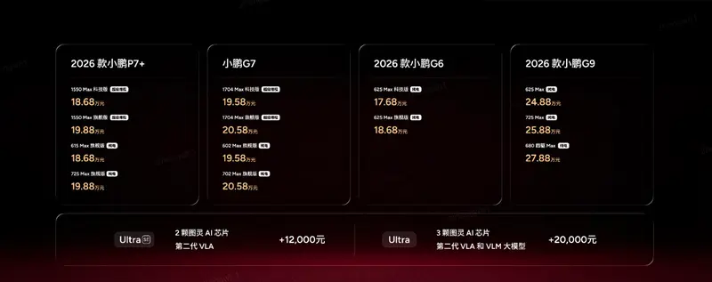 今日,在2026小鹏全球新品发布会上,小鹏汽车正式发布2026 款小鹏 P7+、小鹏 G7 超级增程、2026 款小鹏 G6、2026 款小鹏 G9。其中2026款小鹏P7+ 全球36国同步发布,新车有超级增程和纯电两种能源形式,超级增程有1550 Max 科技版和1550 Max 旗舰版,官方指导售价为18.68万元和19.88万元;纯电有615 Max旗舰版和725 Max 旗舰版,官方指导售价为18.68万元和19.88万元。2026款小鹏G7推出四个版本,超级增程1704 Max 科技版和1704 Max 旗舰版,官方指导售价为19.58万元和20.58万元;纯电602 Max 旗舰版和702 Max 旗舰版,官方指导售价为19.58万元和20.58万元。2026 款小鹏 G6推出纯电625 Max 科技版和625 Max 旗舰版,官方指导售价为17.68万元和18.68万元。2026 款小鹏 G9推出纯电625Max、725 Max和680 四驱Max版,官方指导售价为24.88万元、25.88万元和27.88万元。