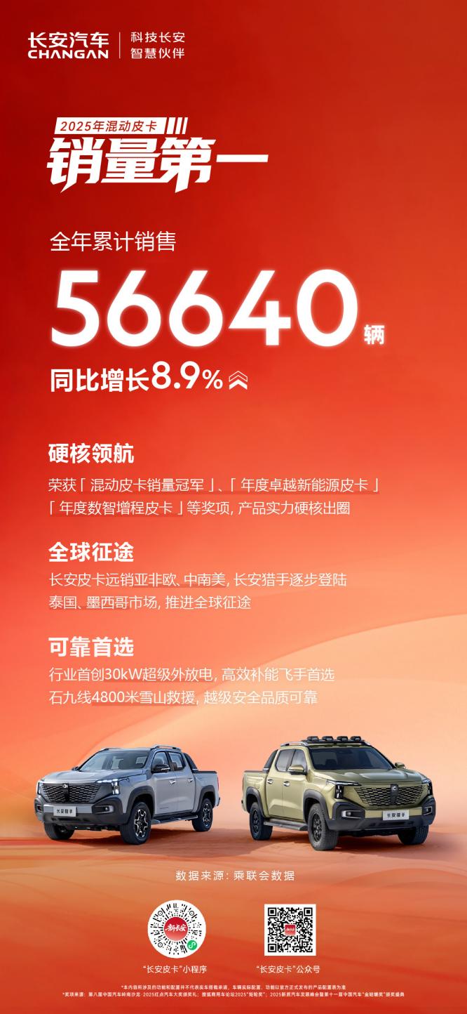 长安皮卡在2025年交出了一份销量与质量并重的优异答卷。长安猎手摘得混动皮卡销量桂冠,是央企品质担当、全球化战略与硬核产品力三者协同发力的必然成果。未来,长安皮卡将继续以用户为中心,重塑数智皮卡新体验,让中国皮卡在全球流行起来!