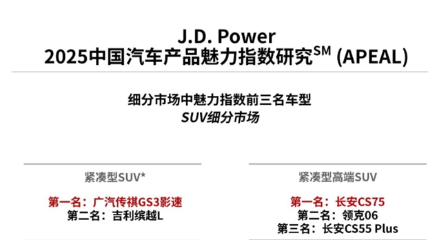 销量是产品实力的直接体现,而品质与口碑则是最好的“护城河”。据中国汽车质量网统计,影速自2023年起稳居自主品牌小型SUV质量冠军,是大厂品质的有力体现。同时,在《J.D.Power2025中国车辆可靠性研究(VDS)》 中,影速荣获紧凑型SUV可靠性第一名;在《J.D.Power2025中国汽车产品魅力指数研究(APEAL)》 中,影速同样位列紧凑型SUV榜首,意味着用户在实际用车中,对其设计、性能、智能化及驾驶感受给予了极高的评价。
