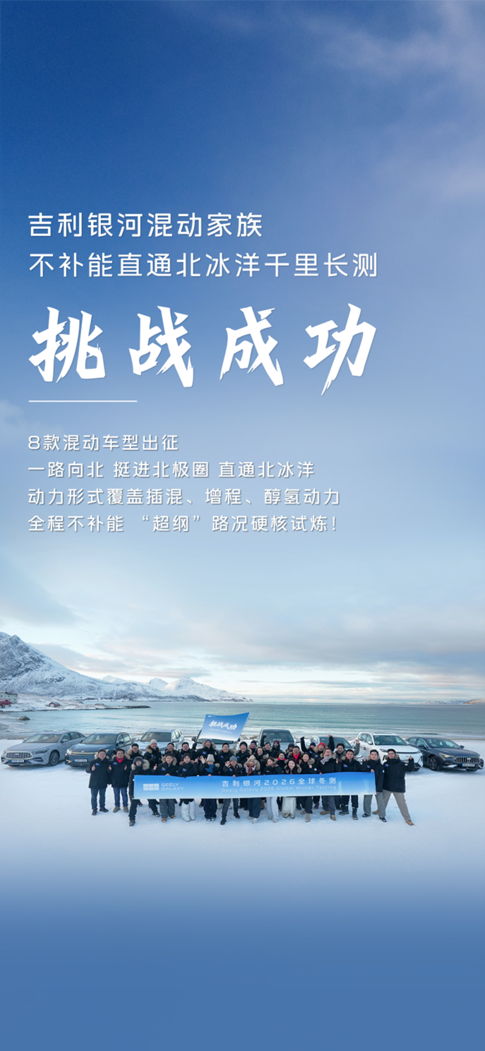 对新能源技术极限的主动验证、对研发不遗余力的大力投入,是吉利银河超越竞品、持续领跑的核心底气。站在2026年1月销量助力吉利汽车登顶中国市场销冠的新起点上,吉利银河正以无畏的闯劲,将“全球研发、全球验证、全域安全”的理念转化为每一位用户触手可及的高价值体验。在全球化征程上,吉利银河已然在北极冰原上留下了属于中国力量的深刻印记,这不仅是“百万银河”时代开启后的首场全球化技术“亮剑”,更是中国汽车工业在世界顶级试炼场上完成的一次壮丽远征。未来,在世界的每一个角落,吉利银河都将像“本地车”一样安全、可靠,以世界的标准,打造世界级好车!