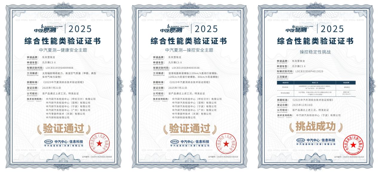 在2025中汽夏测中,凡尔赛C5 X以29%的超低整车太阳辐射透射比和高温VOC零超标的健康座舱,荣获“健康安全认证”。同时,在湿地高速爆胎三大工况——120km/h直线行驶爆胎、120km/h变道行驶爆胎、80km/h弯道爆胎中全部通关,斩获“操控安全认证”。