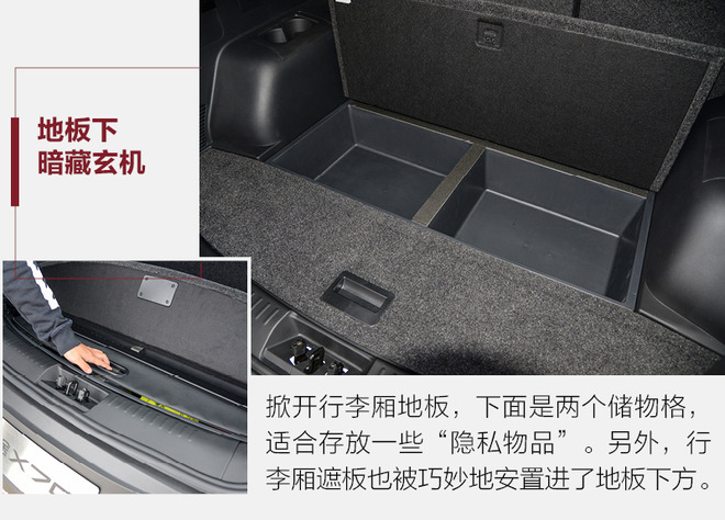 前文提到,捷途X70轴距为2745mm,与主流SUV哈弗H6、吉利博越相比,大了不少。不用说,这也为捷途X70带来了空间方面的优势。经过体验,捷途X70的乘坐空间较对手还是有一定优势的,皮质座椅乘坐起来也比较舒适。另外,车内的储物空间也显示了设计师的良苦用心,每名乘客都能随手找到存放手机的地方,再也不用乱丢了。
