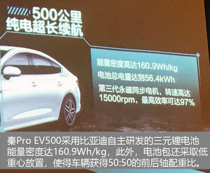 本次试驾的秦Pro EV500是王朝系列纯电动车型的全新产品,也是首款搭载“e平台”的轿车,集比亚迪最新的三电核心技术成果于一身。